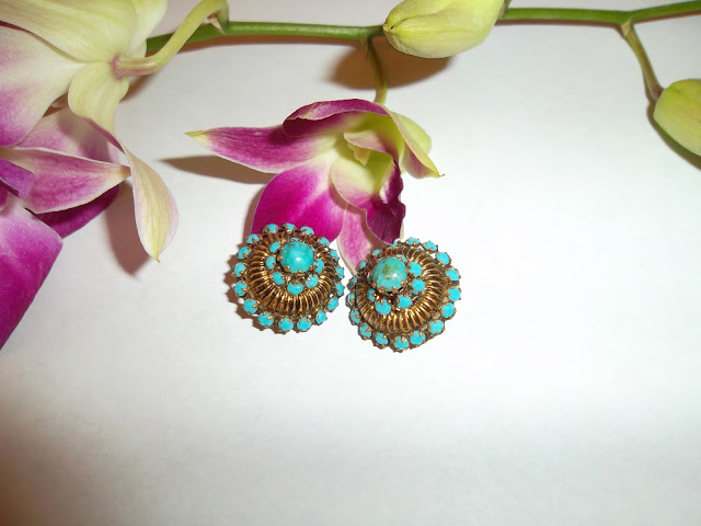 Cerceii vintage anii 60 cu clips din metal comun auriu antichizat accesorizati cu pietre turcoaz. Superbi!!!