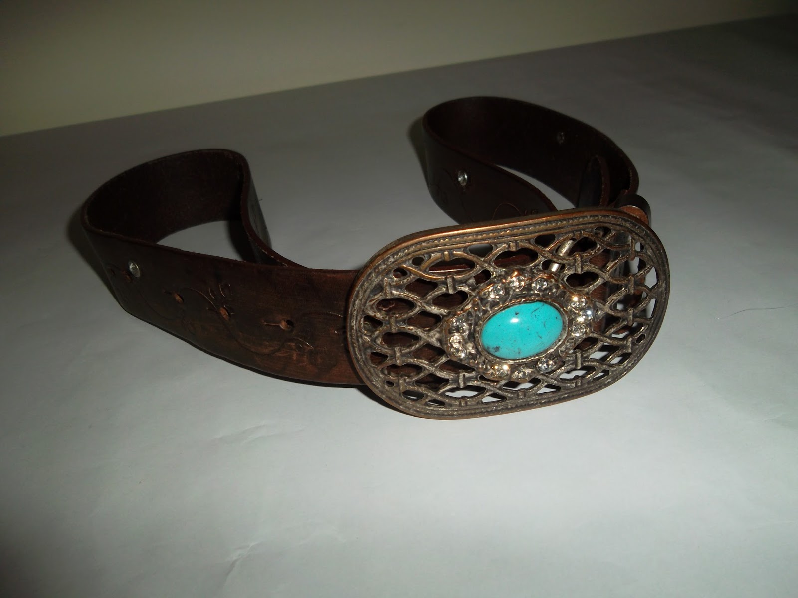 Curea semnata"River Island" confectionata integral din piele naturala cu catarama masiva argintie decorata cu piatra turcoaz si model floral stantat. Superba!!!