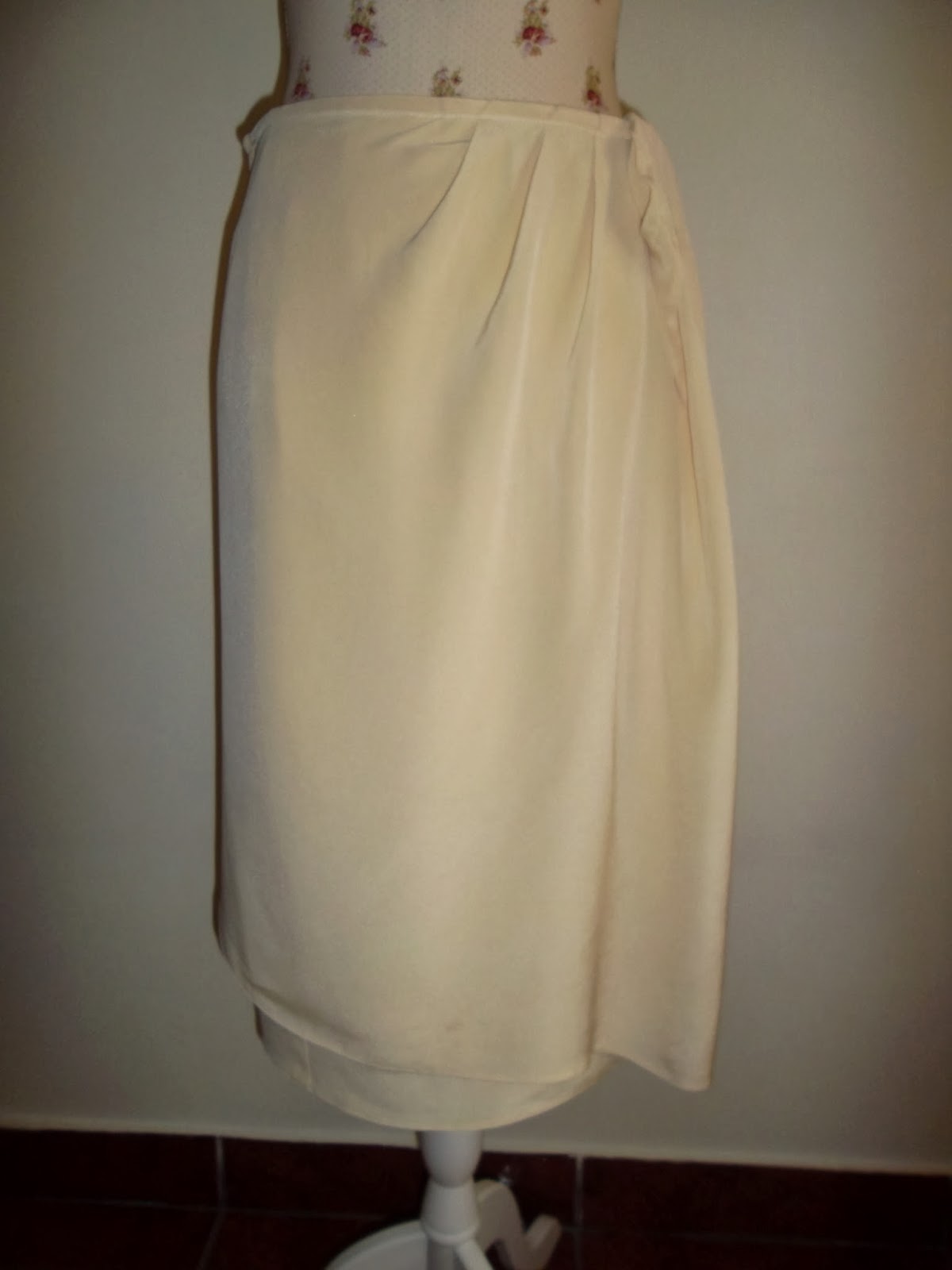 Fusta deosebit de eleganta din matase naturala plina usor asimetrica cu o parte suprapusa decorativa atat in fata cat si la spate. Este captusita in totalitate, se inchide pe lateral cu fermoar. Placuta la purtat culoare reala crem. Mult mai frumoasa in realitate.